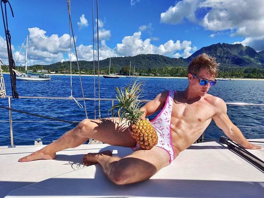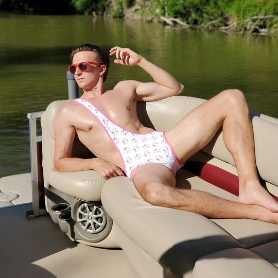 雖然拆開來看它就是一件三角泳褲搭配上一個跨過胸前的帶子,這樣的單肩泳衣在女孩的比基尼造型上也很常見,不過放到男生身上嘛⋯⋯莫名的讓人不知如何是好?