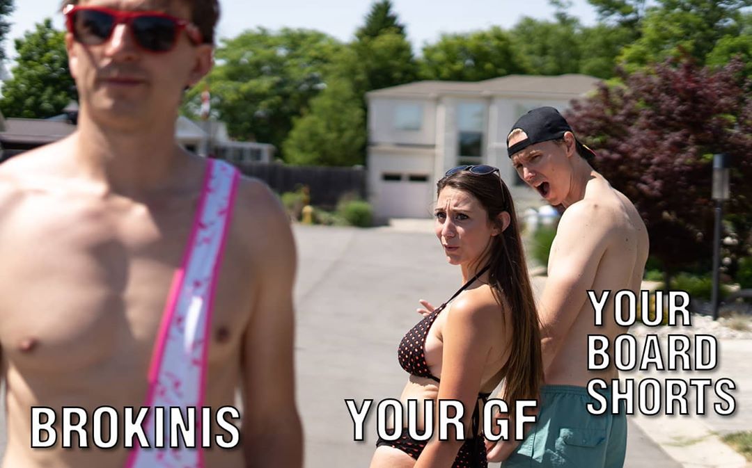 兩人更把宣傳圖做成了好笑的迷因圖,不過這單肩泳衣還是蠻有用處的,不只是可以緊緊包覆男人的小鳥兒,斜肩設計還能露出美麗的身材,也不會因為強力浪花沖刷導致泳褲掉落,也許喜歡衝浪的浪人們可以考慮試試看?