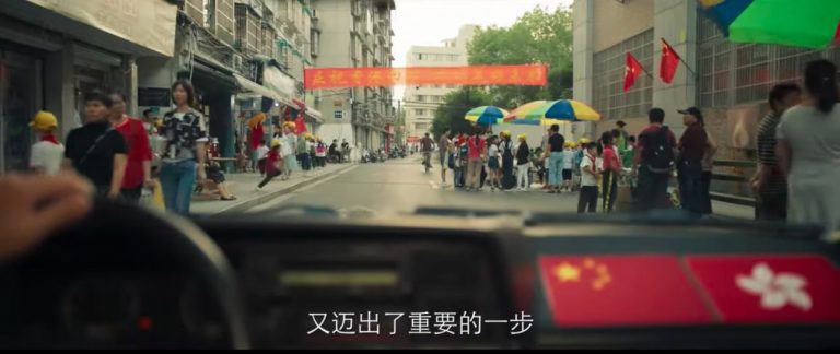 鏡頭中也不時攝進香港區旗及中國國旗。除了街上的建築物或店舖都插著旗幟,不少行人們手上也同樣手持區旗或國旗。