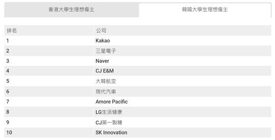 韓國求職網站Incruit於今年6月初公布1,045名大學生最想入職的10大企業,網絡科技企業Kakao榮登榜首,最主要原因是認為公司有前景。至於傳統巨企三星則排第二,現代汽車、LG等亦榜上有名,反映韓國年輕人依然追求高薪及待遇好的工作。