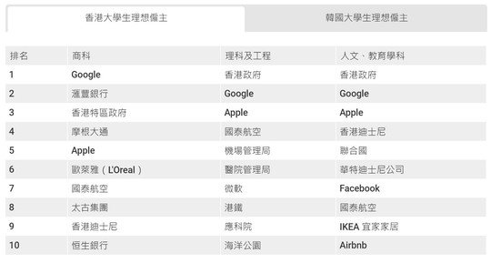 人才戰略公司Universum於2019年12月至今年3月訪問5,993名香港大學生,了解他們心目中最理想的僱主,「鐵飯碗」政府工在各學科排名均打入三甲。另外,在商科心目中,Google更力壓政府成為最想入職的企業。其餘上榜機構包括海洋公園、迪士尼,以至聯合國。