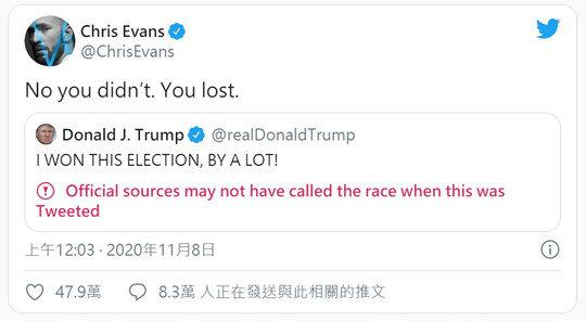 飾演「美國隊長」的演員基斯伊雲斯(Chris Evans)也和許多荷里活影星一樣,不滿特朗普作風,甚至公開支持拜登。所以,基斯伊雲斯一聽到拜登勝選,立刻轉發特朗普先前在Twitter上高喊「我以很大優勢贏了這次選舉」的推文,並揶揄道:「不!你才沒有,你輸了。」