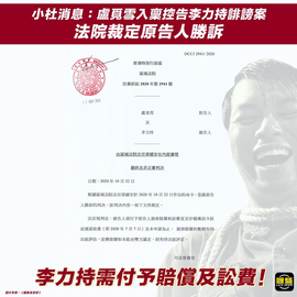 小杜消息:就早前「盧覓雪入稟控告李力持誹謗」嘅案件,區域法院裁定原告人盧覓雪勝訴,被告人李力持需要向原告人付予賠償及訟費!