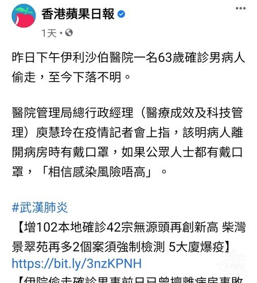 醫管局總行政經理(醫療成效及科技管理)庾慧玲:「我們不肯定是否可尋回,我們強烈勸喻病人可返回醫院,始終他也未完成治療,我們會擔心他健康情況。至於病毒傳染(風險)方面,他最後一次(檢測)病毒量不是十分高,但當然希望大家繼續戴上口罩,做好個人手部衞生,減少感染風險。」