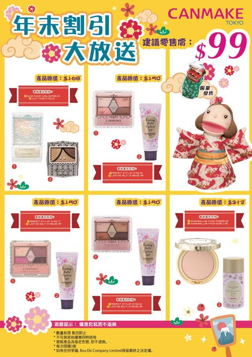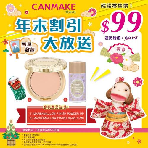 踏入新一年,Canmake特別推出一連串割引大放送,精選5款$99優惠套裝,多款皇牌產品以套裝優惠價發售!