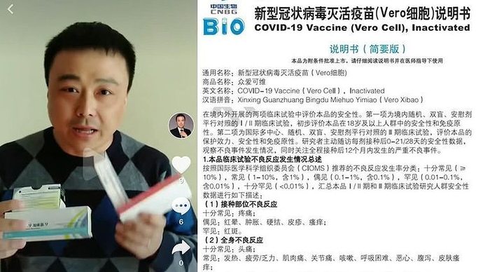 中國醫藥集團(Sinopharm,以下簡稱:國藥集團)研發的武漢肺炎滅活疫苗(不活化疫苗,由已殺滅的病原體製成的疫苗),上周三(12月30日)獲中國當局批准上市,成為中國首次允許在國內廣泛使用的武漢肺炎疫苗,也為該國的大規模接種開了綠燈。然而,中國疫苗專家陶黎納近日卻在微信上貼出這款疫苗的說明書,內容提到接種這款疫苗後副作用(局部或全身不良反應)多達73種,除了常見的接種部位疼痛、頭痛外,更可能出現高血壓、視力減退、喪失味覺及尿失禁等嚴重副作用。陶黎納不但驚呼,他看完倒抽一口氣,還感嘆中國疫苗「一舉成為世界上最不安全的疫苗」。由於這篇貼文引發中國廣大迴響,到了昨晚相關貼文已全被當局刪除。