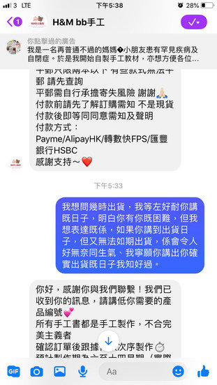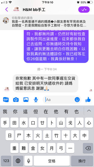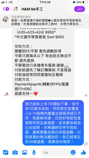 我覺得我比人扼,遲遲都收唔到貨,已經等左26個星期,同原定4-10星期出貨既承諾有出入,鑑於佢自稱係自閉症孩子的媽媽,所以我好有耐性地等待,至多每個月問一問出貨或製作進度,但我最唔開心係,佢從來無交代遲既原因,話明下星期可出貨但最後無蹤影。