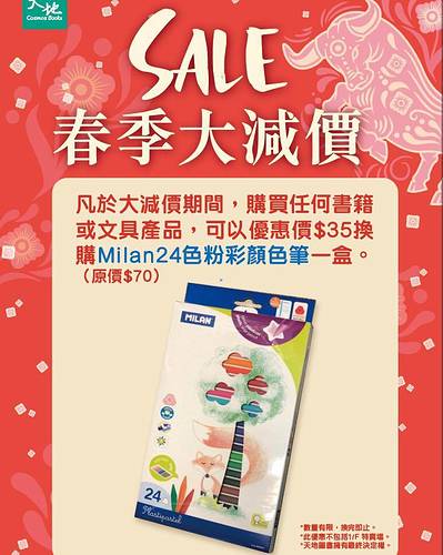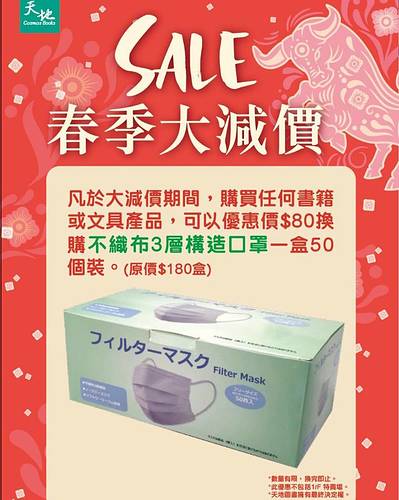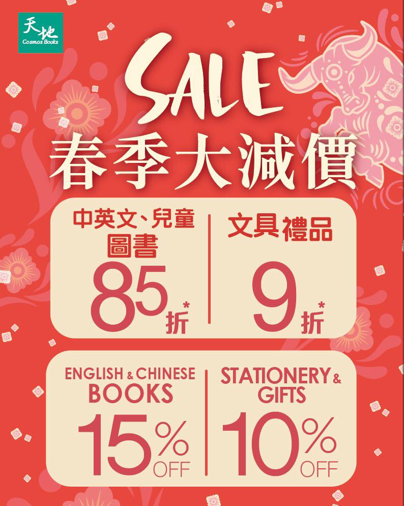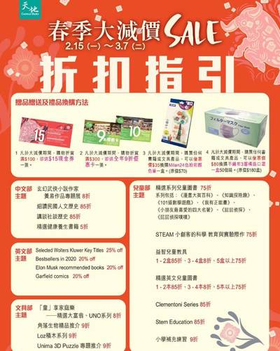 天地圖書現正舉行春季大減價,全線中文、英文、兒童圖書85折,雜誌、文儀用品9折,凡購物折實滿指定金額,再送現金券及可享即時回贈!