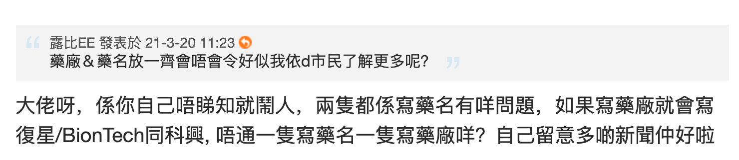 我諗好多香港人都未必知科興藥名係乜, 咁有人指正返, 咪講聲多謝, 成件事已完左,