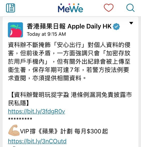 //資訊科技總監辦公室不斷掩飾「安心出行」對個人資料的侵害,對於處理用戶出行紀錄的說法更前後矛盾:一方面經常強調只會「加密存放於用戶手機內」、不會備存;但同時又在聲明中自爆,有關外出紀錄會被上傳至衞生署,保存年期更長至7年。//
