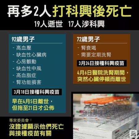 疫苗接種︱港多2人打科興後亡 19逝世17涉科興 遲16日披露92歲翁過身 72歲男洗腎猝死
