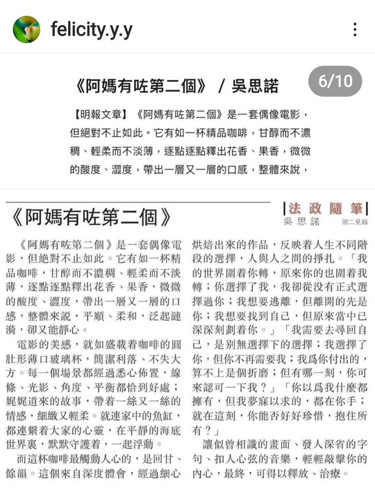 相信普遍觀眾對《阿媽有咗第二個》的期待值都在姜濤與柳應廷身上,個人倒是因為彭秀慧的名字,她的前作《29+1》可說是近年最佳港產片之一,作為第二部執導的長片,依然極為期待,看後雖然難及《29+1》的高度,還是出色之作。這或許是一部「捧新人」電影,卻不如《假冒女團》般難堪,也有個紮實的劇本與細膩的人物關係圖,看時充滿窩心情味,縱有不少「Fans向」、給兩位新人個人表演發揮情節,亦不會流於突兀難看,兼具劇情需要。若《阿媽有咗第二個》能早一點上映,這不難成為一部極出色的母親節電影,描述「阿媽」面對人生不同階段的困惑,寫來情感真摯迷人,毛舜荺再堪影后級的演出,更為之動容,不期想起南韓同類《82年生的金智英》,沒有流於荷里活式「女權至上」,以不同細節歌頌母愛,寫來真切動人而不煽情,再展彭秀慧擅長的拿手好戲。同為「英皇大電影」,同期的《神探大戰》不堪入目,這縱無大型動作場面,起碼充滿本土情味,即使多條支線都可以拉攏中國演員或背景,喜見仍堅守是個發生在香港的故事,充滿地道生活化的味道。彭秀慧寫情及駕馭角色內心戲的功架仍在,《阿媽有咗第二個》你既可當作一部偶像片去看,亦可當作香港鮮見的文藝小品去看,當可與同期的《緣路山旮旯》互相輝映。