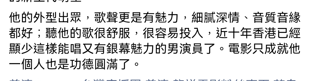 他的外型出眾,歌聲更是有魅力,細膩深情、音質音緣都好;聽他的歌很舒服,很容易投入,近十年香港已經顯少這樣能唱又有銀幕魅力的男演員了。電影只成就他一個人也是功德圓滿了。