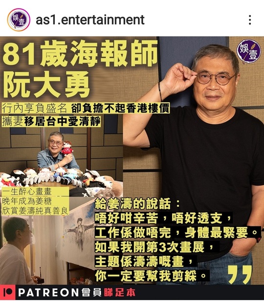 一位80歲的老人家,身為電影海報一代宗師,誰想到阮大勇晚年成為了一粒姜糖,跟太太一齊追星,今次返港除了探朋友,還去了幾處姜濤應援站打卡,老得可愛,「點解咁鍾意姜濤?有日喺台中聽佢嘅《作品的說話》,令我好感動,我嘅時代係披頭四John Lennon嘅級數先會唱呢啲歌,好多歌星都唔會唱呢啲歌,第一,唔係好商業化,第二,有少少反戰嘅意思,所以我留意佢,留意佢嘅一舉一動,我覺得後生仔好似佢咁嘅性格、品德係好少有嘅,就開始欣賞佢。