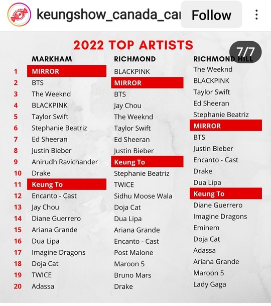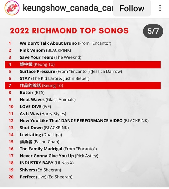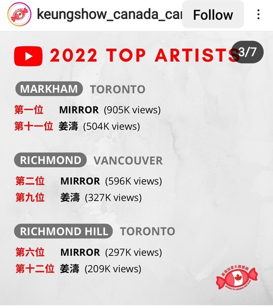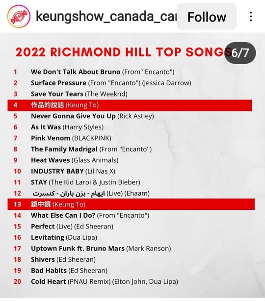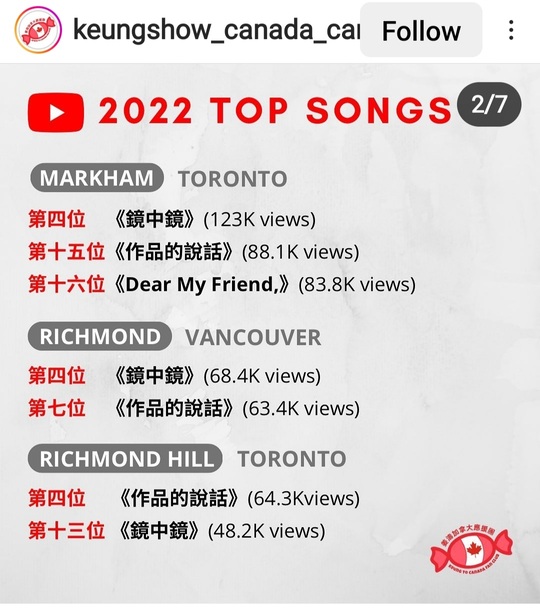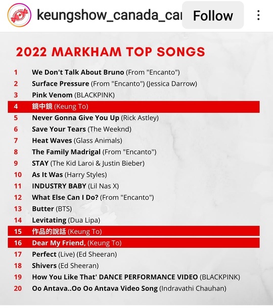 In three cities of Canada, three of Keung To’s songs made to Top 20 Chart in YouTube Canada’s “Top Songs”. Keung To and MIRROR are the only HK artists made it to Top 20 Chart in YouTube Canada’s “Top Artists” in these three cities.
