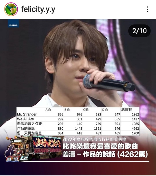 《叱咤樂壇流行榜頒獎典禮 2022》今(1 日)晚在亞博舉行。由樂迷及現場觀眾投選的「叱咤樂壇我最喜愛的歌曲大獎」,最終由 MIRROR 的姜濤憑〈作品的說話〉奪得,是他連續三年奪得此獎。姜濤和編曲的 Gareth.T、監製 Edward Chan 一齊上台領獎。