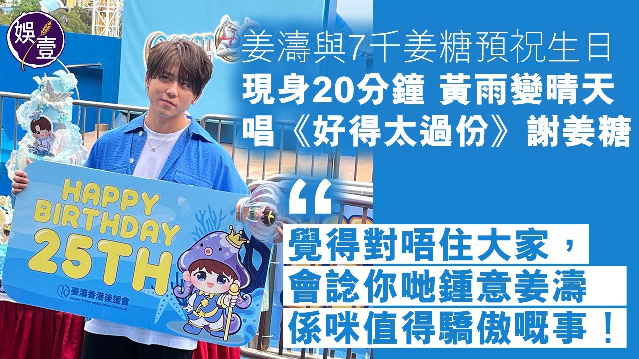 「壽星仔」姜濤以藍白造型現身《海洋王國.生日慶典》,同3000名幸運姜糖齊齊切蛋糕慶祝25歲生日,仲得到幸運之神眷顧,表演期間即停雨兼放晴,難怪壽星姜頻頻話要多謝上天!