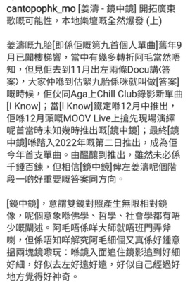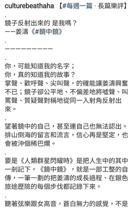 很替薑濤和他的團隊開心,鏡中鏡得到好大迴響而且評價好高,不單只在音樂範疇,評論和探討還引伸至文學和心理層面,鏡中鏡是有靈魂的藝術品。
