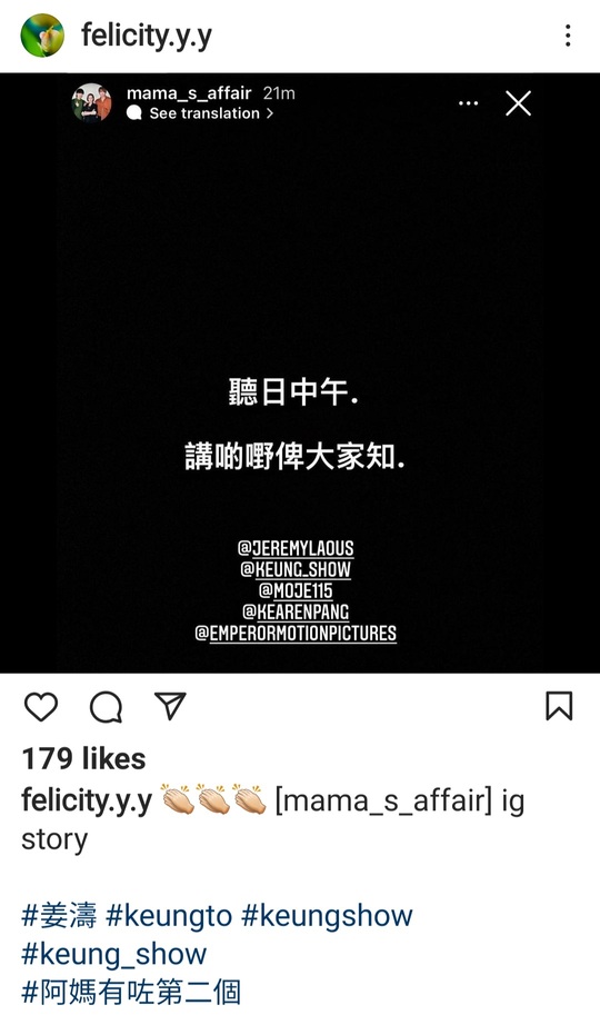 受謠言中傷的薑濤,淩晨亦於IG Story出post,應該是收工回家途中,寫道「最辛苦的一天」,加上「面青」emoji