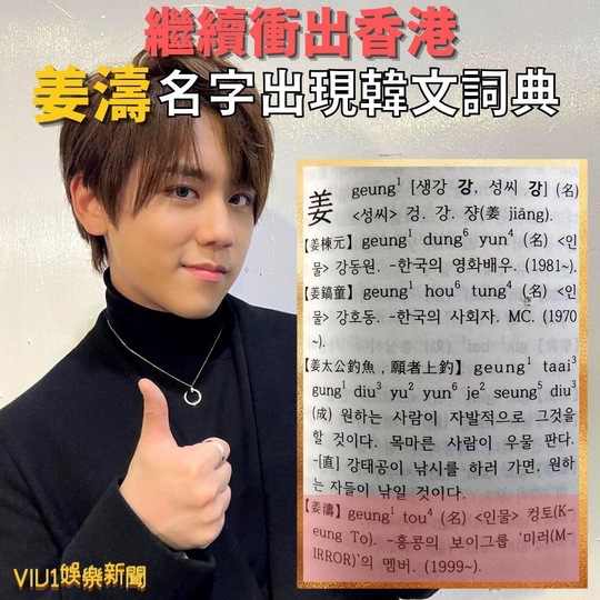 男團MIRROR在香港的人氣無庸置疑,而去年盧瀚霆(Anson Lo)於韓國MAMA勇奪亞洲區最佳新人、薑濤被著名雜誌《Tatler》選為「亞洲最具影響力人物」之一,及獲荷裏活權威媒體《Variety》雜誌選為「國際突破之星」,可見MIRROR的知名度已不再局限在香港。近日,有網民發現「薑濤」的名字被收錄在《廣東話韓文詞典》中,對於有香港年輕偶像出現在廣韓字典,不少人均感到非常驚訝。