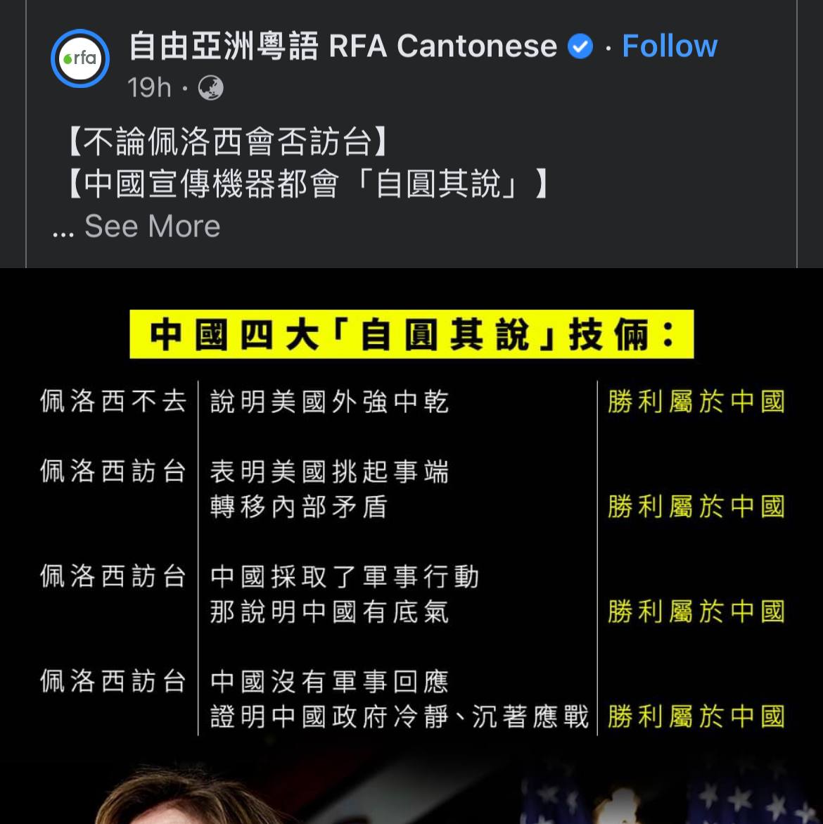 大媽4: “如果佩洛西真係訪台,今勻唔排除解放軍真係出導彈。”