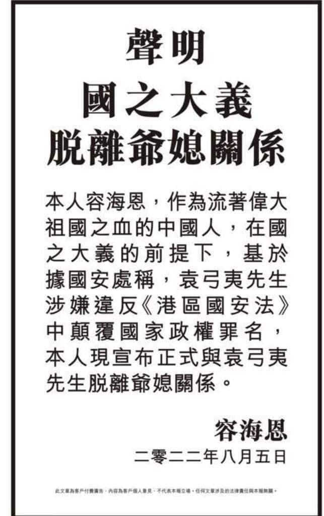 個title 改做” 袁彌昌未脫離父子關係一下,容海恩宣布不再任袁家媳婦” 會好d