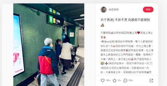 香港與內地通關後旅客增加,有上海旅客就在網上發文稱在香港被「震撼教育」,列出他看到的香港3項優點,包括自覺排隊等,大讚是「文明社會」,明言「其他地方的人的優點我們應該學習一下」。帖文引來內地網民熱議,「有秩序才高效,真的很羨慕」、「很中肯,要承認香港人的確素質高」。