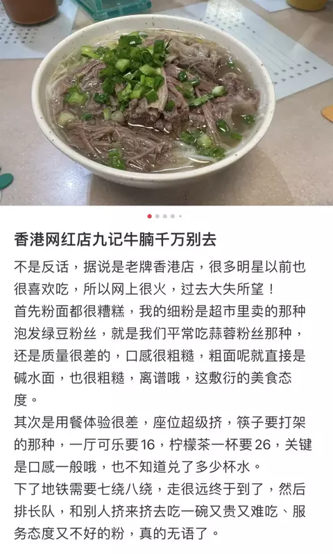 不過,不少內地遊客專程到訪,卻似乎未能盡興而歸。日前,就有內地女遊客在社交平台小紅書上以「香港網紅店九記牛腩千萬別去」為題,發文批在九記牛腩用餐的不快體驗。首先,她指牛腩粉水準不似預期,直言麵底質地差,米粉如超市買到的即食「蒜蓉粉絲」,而粗麵,也就是梘水麵,口感同樣粗糙,直言店家料理是態度敷衍。她又指九記用餐環境麻麻,且服務欠奉,座位擠迫如「筷子要打架的那種」。最後,她又感覺九記取價離譜,一杯檸檬茶要$26,疑似兌水太多。文章得到不少內地網友認同,指在九記牛腩用餐是「給錢買難受」,又謂「服務差也忍了,但真的不好吃」,更特別提到九記會針對說普通話的客人,客人若說普通話會比講粵語的熟客差得多。