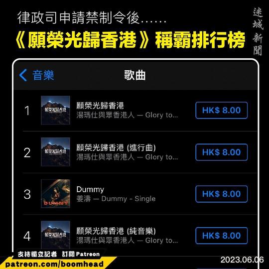 律政司向法庭申請禁制令,禁止播放演奏 《願榮光歸香港》後,Itunes排行榜首4位中,《願榮光歸香港》正式版、進行曲版、純音樂版,分別急升至第1、2、4位