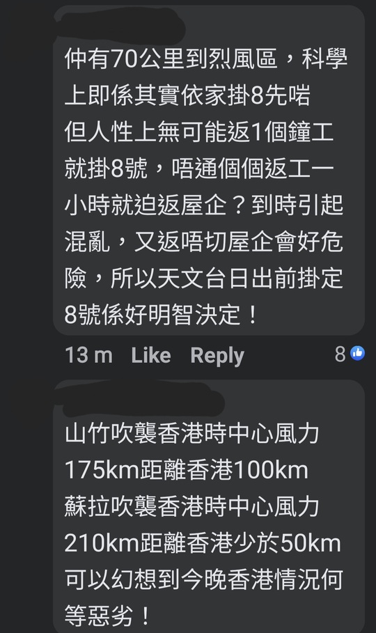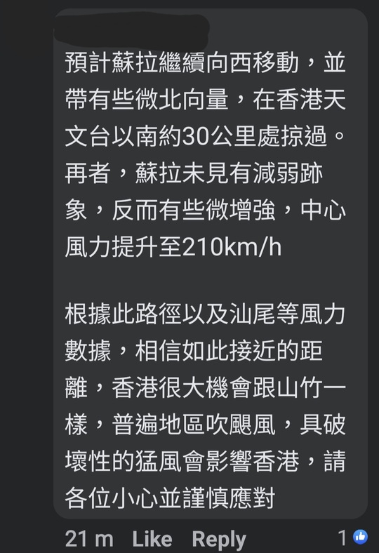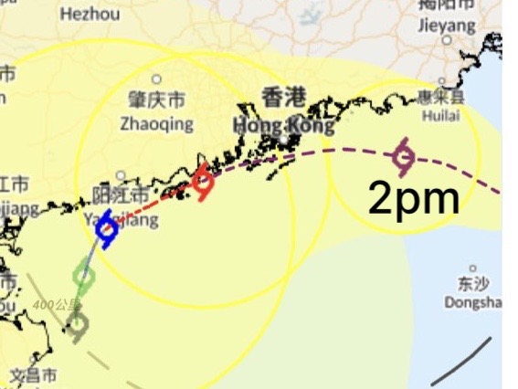 按照現時預測路徑,蘇拉會在入夜後開始進入天文台總部以東100公里範圍內。市民應盡快完成一切防禦措施。