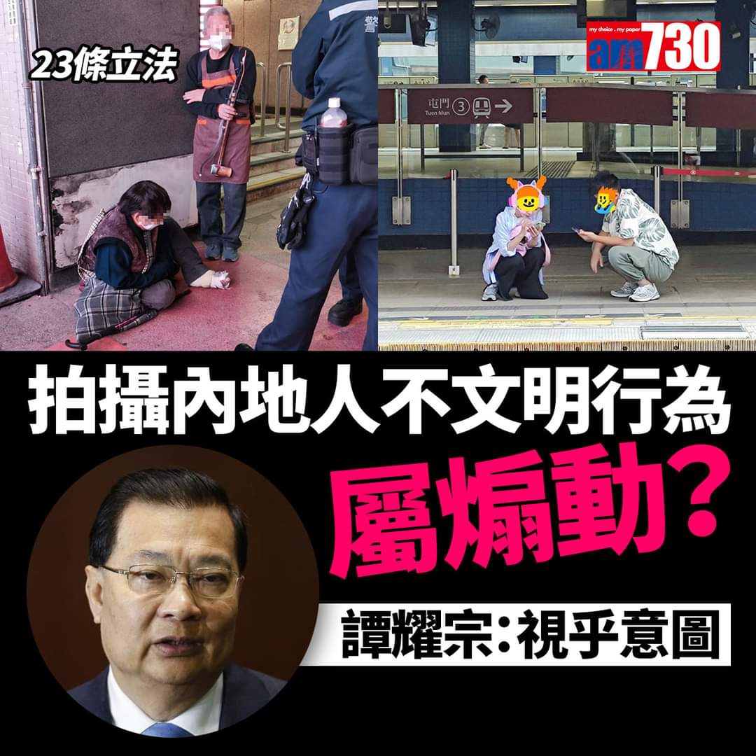 政府昨日(30日)展開《基本法》23條立法諮詢至2月28日。前全國人大常委、全國港澳研究會副會長譚耀宗今(31日)在電台接受訪問。對於文件中的「煽動」罪行,提及其中一項意圖為「引起香港特區居民間或中國不同地區居民間的憎恨或敵意」,若有港人拍下一些內地旅客的不文明舉動,或是內地人拍下香港一些不友善的服務態度,算不算挑撥香港與內地人的矛盾從而犯法,譚耀宗說普通法精神中「意圖」十分重要,需要證明發布訊息的人是否意圖挑撥離間,對社會帶來很大影響。