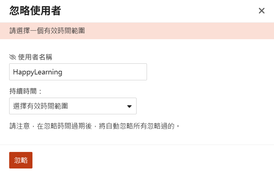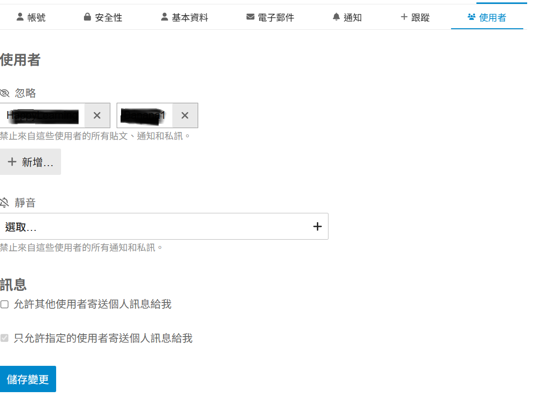偏好設定 > 使用者 > 忽略 輸入某會員名