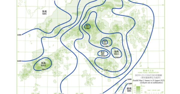 本港各區今年(截至8月20日)的累積雨量分佈差別頗大,屯門及元朗區錄得少於1400毫米,而大帽山、大老山附近及香港東南部(包括九龍東、將軍澳及港島東)則超過2200毫米。其中將軍澳錄得2503.0毫米累積雨量,而慈雲山、大老山及大帽山更分別錄得2608.0、2563.0及2517.5毫米累積雨量。