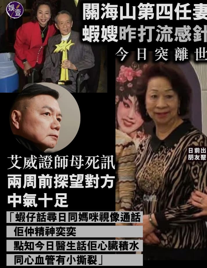 艾威覆述蝦嫂兒子通知,指醫生發現送院蝦嫂有心臟積水,及心血管有少少撕裂現象。「蝦仔(關可維)通知我,話蝦嫂今朝走咗。佢話尋日仲同媽咪視像通話,精神還好。佢尋日走去打流感針,唔知係咪打完又冇好好休息。」