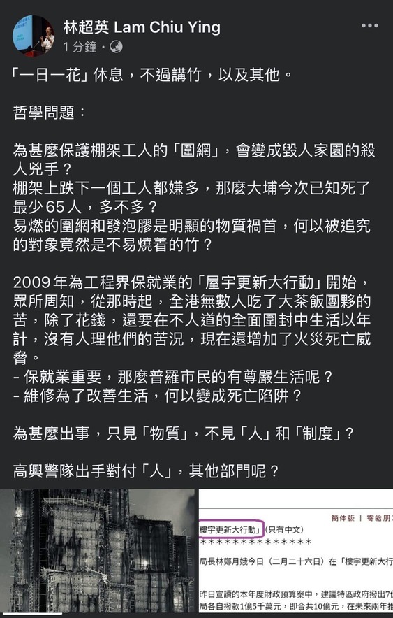 2009年為工程界保就業的「屋宇更新大行動」開始,眾所周知,從那時起,全港無數人吃了大茶飯團夥的苦,除了花錢,還要在不人道的全面圍封中生活以年計,沒有人理他們的苦況,現在還增加了火災死亡威脅。