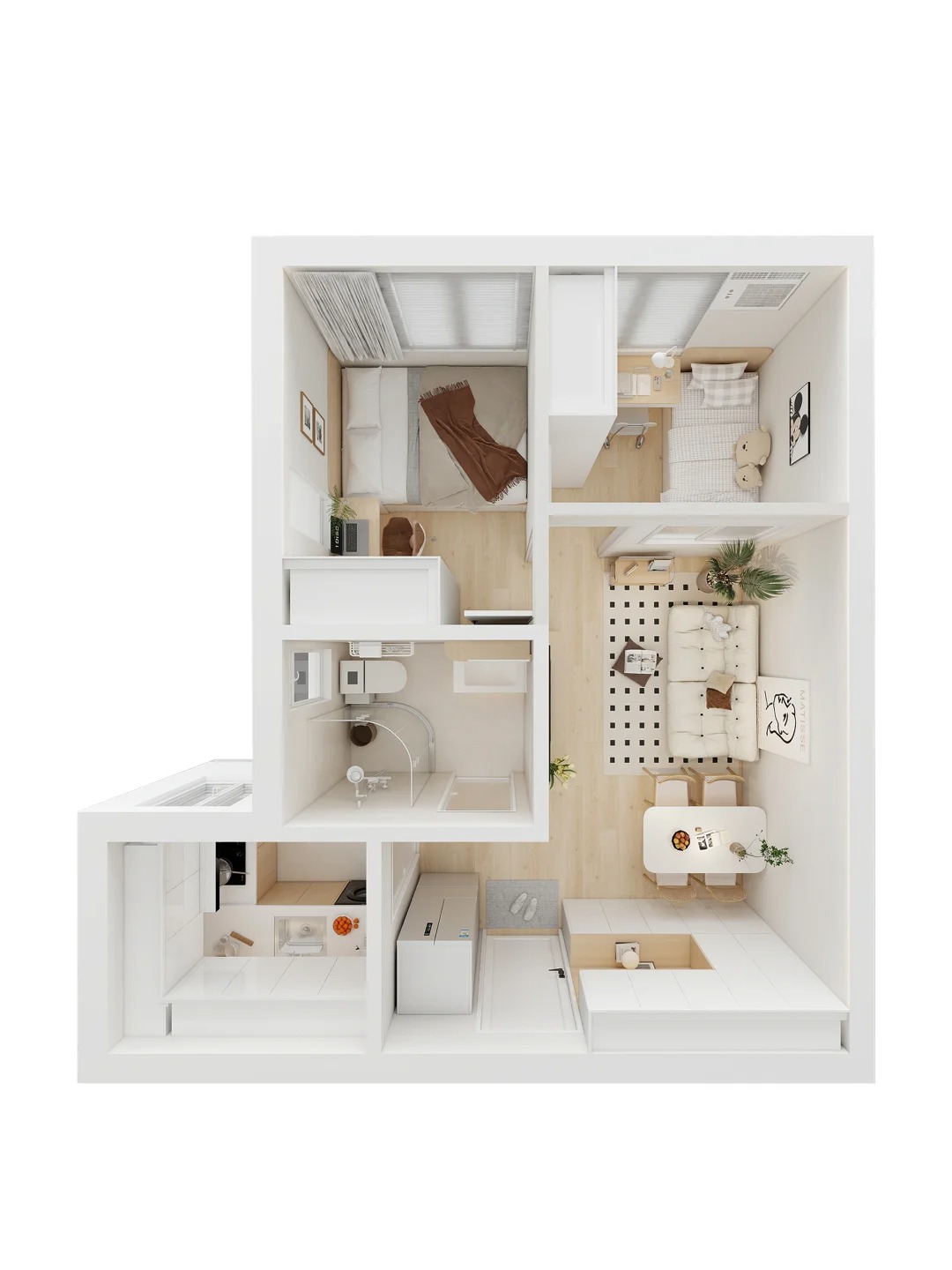 房間有部份𥦬有衣櫃遮擋,窗闊度細咗,陽光經窗 去到門或窗,成一直線進入客廳機會又低咗。