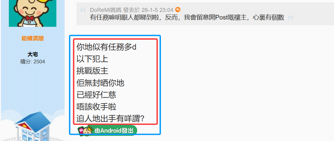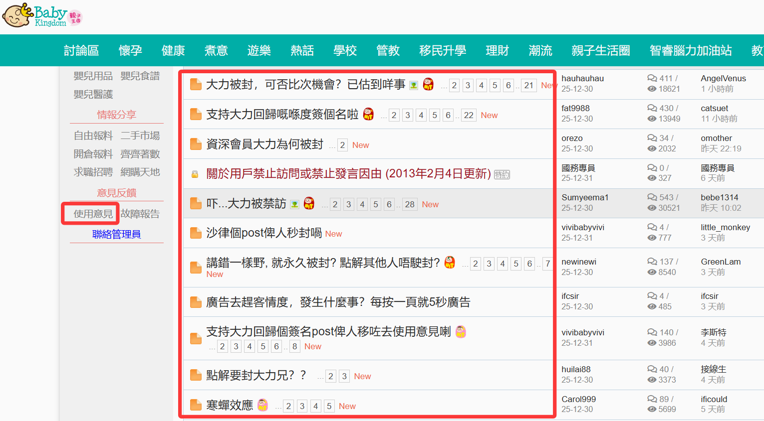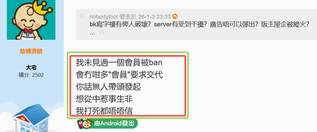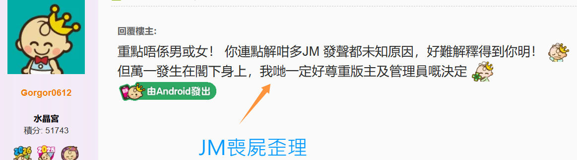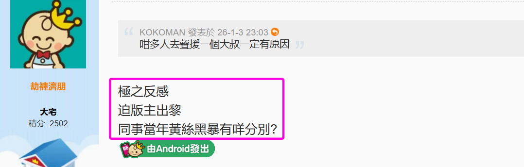 之前有人開 POST 支持封鎖停權大力縮,但始終網軍人數眾多,邊個出聲就被圍攻,就如支持大力縮果班喪屍 JM 口中、欺淩大力縮一樣、佢地都係欺淩緊持相反意見之人,即係乜都係佢地圍爐講哂 ! 我覺得佢地一向持人多,成日去版管區撤散抗議,整得多版管都潛意識討厭佢地,尤其大力乜都認叻,認叻乜都否決人地留言意見,等於係欺淩一樣,不過出自果班喪屍 JM 口中,公就佢地贏、字就對家輸道理一樣。