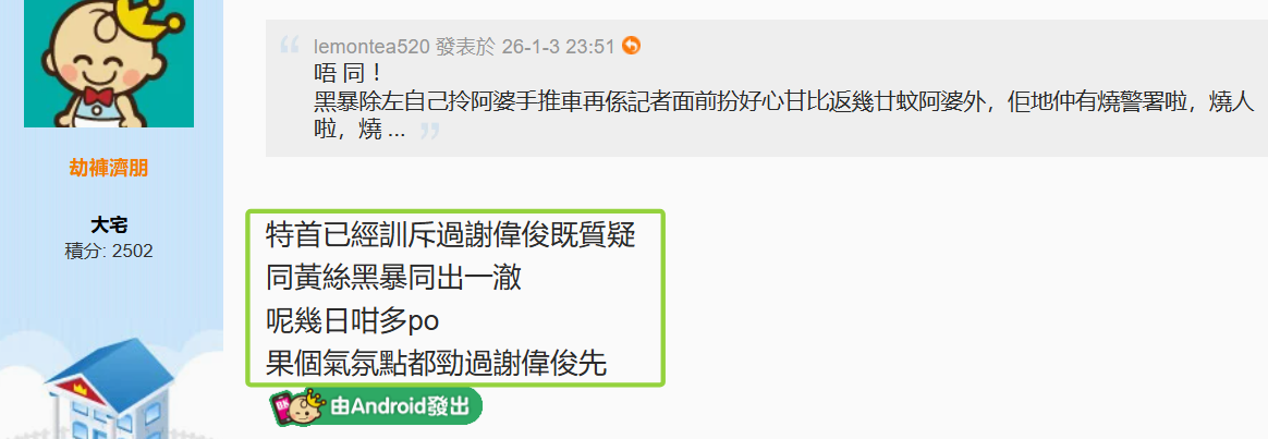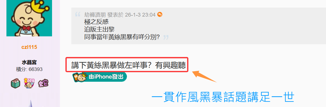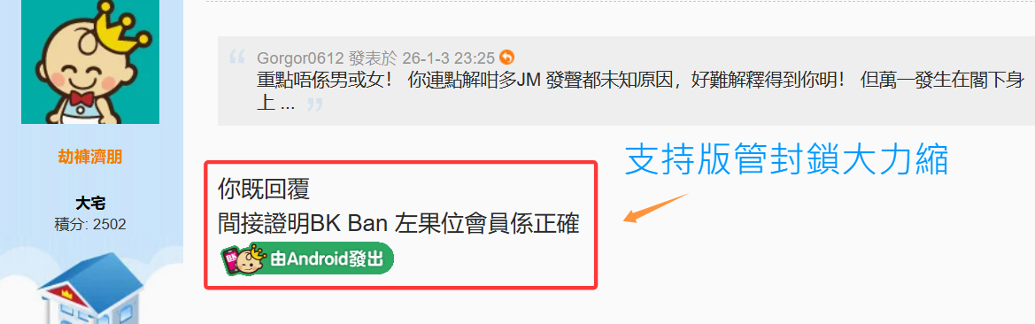 依家表面上好似過百會員,齊留言撐佢恢復解封。但實際上之前一直都有一撮人,都係好唔滿意大力縮,成日刻意挑佢機串佢窒佢,只係現在風頭火勢,果班人靜觀其變,以免槍打出頭鳥被圍攻。雖然反大力縮人數,應該唔夠佢地多,但都唔係小貓三四隻。佢地猛話版管、及某幾個資深會員欺淩大力縮。但依家佢地咪又係、集體欺淩版管及反大力縮人士 ![]()