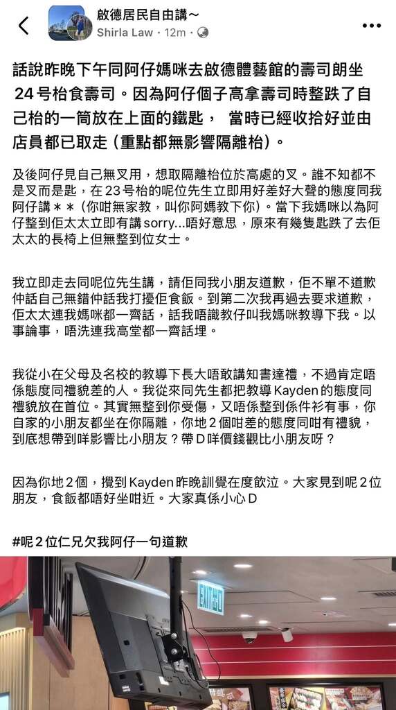 去人枱攞嘢整跌嘢落人哋張凳度,竟然覺得自己個仔冇錯,仲要2次要人同佢個仔道歉,仲要影相公審人,真係CLS阿媽。